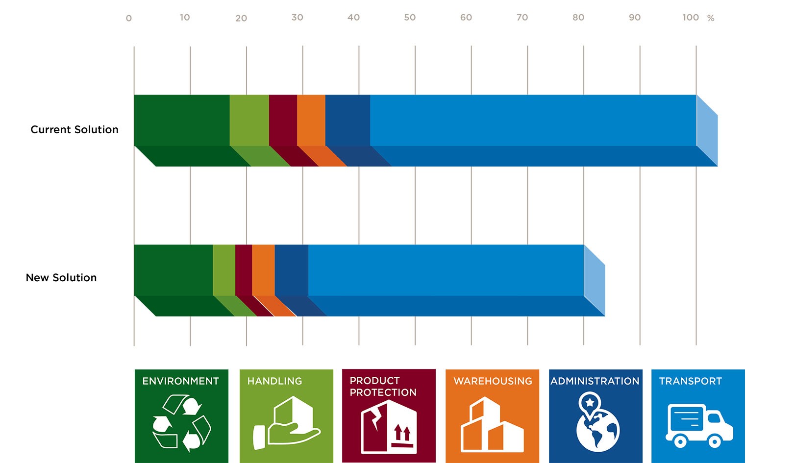 耐帆的总成本法旨在通过优化包装,降低总成本和对环境的影响,同时仍要确保它能充分保护产品。 通过解决不同的成本因素,可以确定最佳包装材料类型、尺寸和内包装,从而在降低总体成本的同时,提供最佳的保护。
