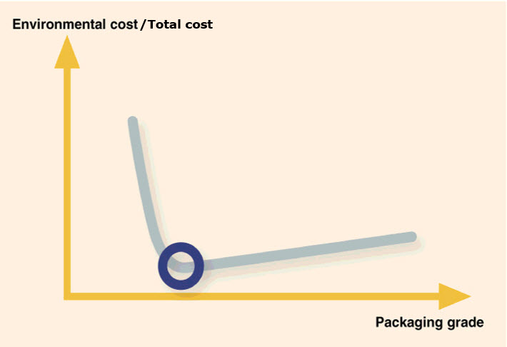 包装方案的“最佳效益点”也将物流总成本计算在内,包括估计无效包装的数量。在这一点处,包装材料用量适当而不过度,遭到损坏的产品数量最低。包装方案的成本和相关要素的成本在最佳平衡点都达到最低,同时保证将您的产品安全护送到目的地。